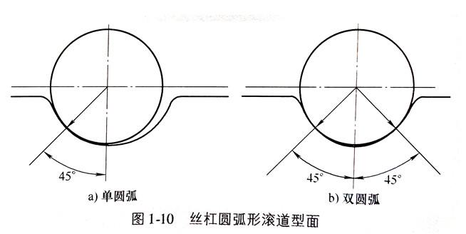 螺紋滾道型面是指通過滾珠中心作螺旋線的法截平面與絲桿、螺母螺紋滾道面的交線的形狀。這個(gè)型面也稱為螺紋法向截形。這個(gè)滾道型面的幾何形狀、尺寸以及材料的機(jī)械性質(zhì),對滾珠螺旋傳動的承載能力、摩擦特性、軸向剛度和軸隙調(diào)整均有較大影響?;谏鲜龈饕蛩氐目紤],目前國內(nèi)應(yīng)用得最廣的滾道型面,有單圓弧形和雙圓弧形兩種。如圖1-10所示