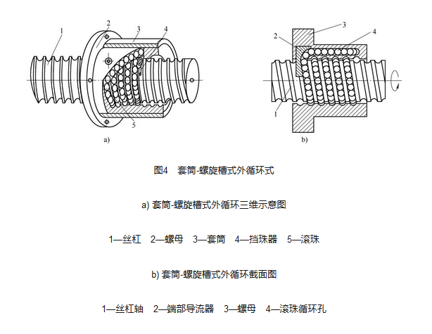 (1) 套筒-螺旋槽式。在滾珠螺母外圓柱面上加工有螺旋形凹槽作為滾珠循環(huán)通道, 凹槽的兩端分別加工有與螺旋滾道相切的通孔, 將兩個(gè)擋珠器(端部導(dǎo)流器) 裝于螺母內(nèi)表面?zhèn)瓤字?span>, 弧形擋珠桿與螺旋滾道相吻合, 桿端部舌形部分將引導(dǎo)滾珠進(jìn)入回珠通孔, 返回初始螺旋滾道, 形成滾珠鏈運(yùn)動(dòng)。為防止?jié)L珠從回珠槽內(nèi)脫出, 用套筒緊套在螺母外圓柱上, 從而構(gòu)成了滾珠鏈的封閉循環(huán)運(yùn)動(dòng), 即套筒-螺旋槽式外循環(huán), 如圖4 所示。 這種形式結(jié)構(gòu)簡(jiǎn)單, 螺母外徑較插管式小20% ~ 30%, 軸向排列緊湊, 節(jié)約空間; 有效負(fù)載滾珠多, 承載能力較高; 剛度大, Dn 值最高可達(dá)18 萬(wàn); 運(yùn)行噪聲低。與單圈內(nèi)循環(huán)式相比, 該方式工藝性好, 生產(chǎn)不受批量限制, 且單、雙列結(jié)構(gòu)均可采用。一般情況下, 單列優(yōu)于雙列, 只有當(dāng)單列螺母上工作圈數(shù)超過(guò)3. 5 圈時(shí)才用雙列; 而雙螺母預(yù)緊時(shí), 最好以兩圈為列(即2. 5 ×1), 但此時(shí)在一列中的滾珠數(shù)比其單圈內(nèi)循環(huán)多, 即滾珠運(yùn)動(dòng)鏈長(zhǎng), 運(yùn)行阻力增大, 且在螺母體上的回珠槽與回珠孔不易準(zhǔn)確平滑連接, 拐彎處曲率半徑小, 滾珠急劇轉(zhuǎn)向時(shí)運(yùn)動(dòng)不平穩(wěn), 從而影響滾珠運(yùn)動(dòng)的流暢性和靈活性, 此外這種形式的滾珠絲杠副螺母徑向尺寸也較大。擋珠器的弧形桿剛度較差, 特別是舌形部分易于磨損, 壽命較短。