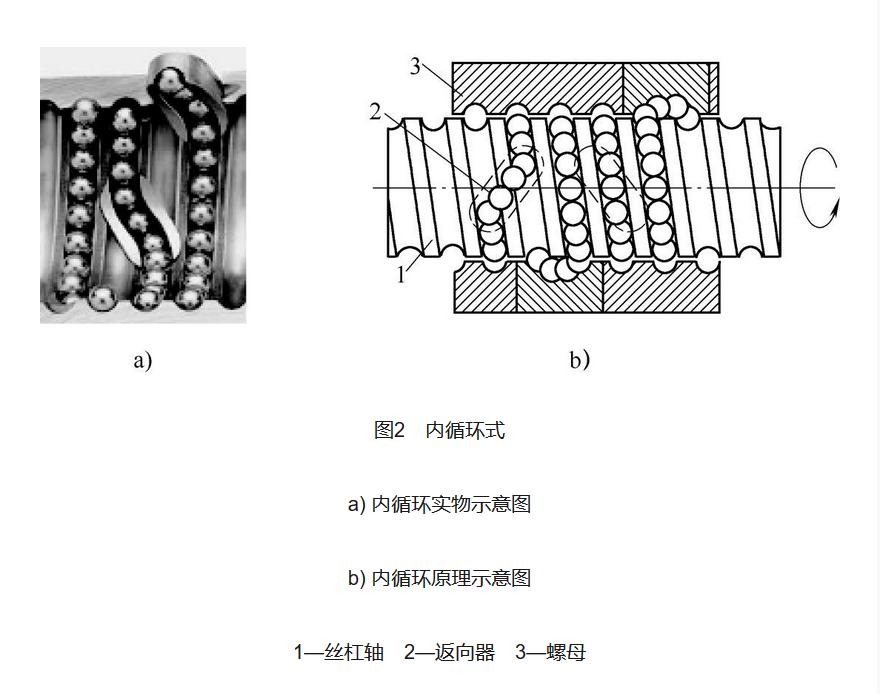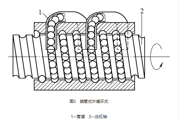 滾珠循環(huán)方式按滾珠在循環(huán)反向過(guò)程中與絲杠表面脫離與否, 可分為內(nèi)循環(huán)式和外循環(huán)式, 如圖1 所示。 1、內(nèi)循環(huán)式