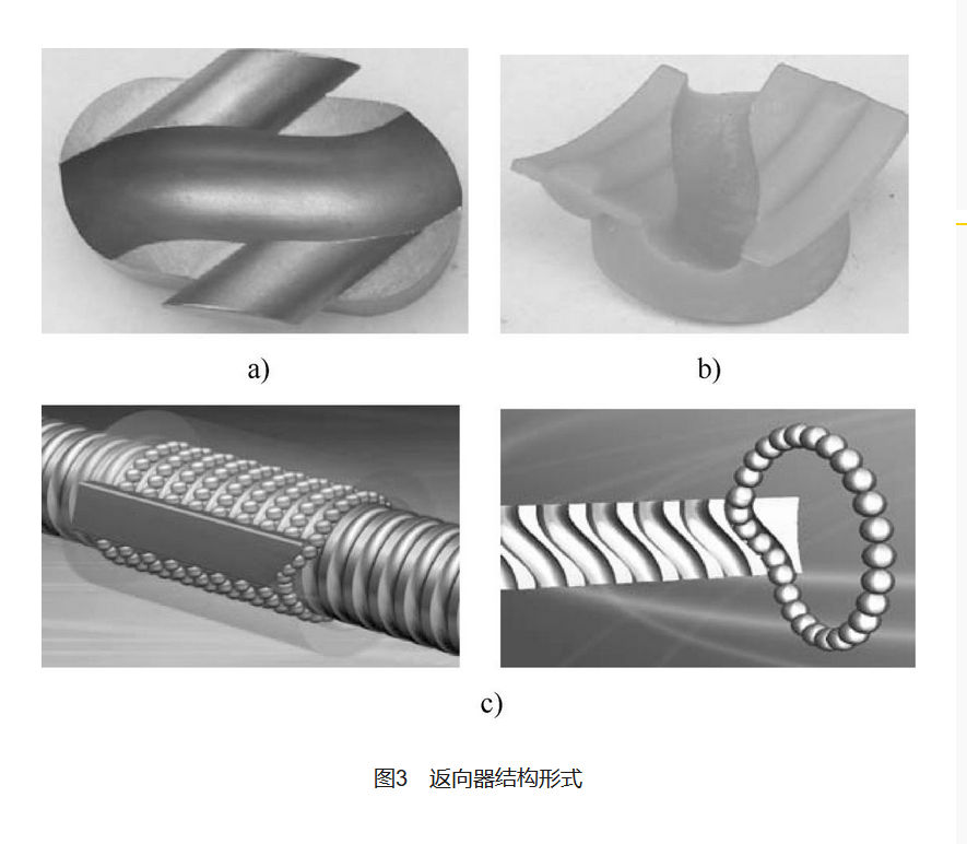 根據(jù)返向器的結(jié)構(gòu)形式, 可分為扁圓形返向器、圓形(又稱凸鍵形) 返向器和矩陣形(又稱多列陣) 返向器, 如圖3 所示。 扁圓形返向器的結(jié)構(gòu)類似一個(gè)扁圓腰子形鑲塊, 緊固或焊接在螺母上的扁圓孔中, 其優(yōu)點(diǎn)是軸向尺寸短, 可有較多圈數(shù), 承載能力較高, 且結(jié)構(gòu)緊湊美觀, 缺點(diǎn)是扁圓孔的加工、測(cè)量較難, 且精度不易保證, 裝卸也較麻煩; 圓形返向器的兩個(gè)對(duì)稱鍵、鍵槽對(duì)稱精度以及深度均需控制, 制造工藝性較差, 其余部分加工則較扁圓形有較大改善, 但仍存在軸向尺寸大、裝配較困難等缺點(diǎn); 矩陣形返向器的相鄰螺紋通過(guò)條狀的循環(huán)裝置形成一個(gè)滾珠循環(huán)鏈, 多個(gè)滾珠鏈共用一個(gè)返向裝置。其結(jié)構(gòu)緊湊, 沒(méi)有無(wú)效圈, 同等長(zhǎng)度下承載圈數(shù)最高,同等導(dǎo)程下鋼球直徑可設(shè)計(jì)至最大。 內(nèi)循環(huán)式結(jié)構(gòu)設(shè)計(jì)簡(jiǎn)單, 螺母外徑小, 可進(jìn)行微型設(shè)計(jì), 滿足最小空間安裝, 裝配簡(jiǎn)便, 適于批量生產(chǎn); 滾珠運(yùn)行阻力相對(duì)較小, 起動(dòng)容易, 滾珠流暢性好, 靈敏度較高; 摩擦損失少, 傳動(dòng)效率較高; 滾珠回程較短, 剛度較好, 運(yùn)轉(zhuǎn)精度較高。但返向器回珠槽為空間曲面, 呈S 形, 加工較困難, 對(duì)滾珠絲杠副的公稱直徑、絲杠外徑、螺紋滾道牙形與接觸角、牙頂圓角(保證圓滑過(guò)渡) 等加工要求亦較高, 不便于多滾道設(shè)計(jì), 且絲杠一端螺旋溝槽須貫穿, 肩部軸徑尺寸須小于溝槽底徑, 否則無(wú)法組裝螺母。此類絲杠適用于中小導(dǎo)程、中低速度場(chǎng)合, 如3D 打印機(jī)、中小型醫(yī)療掃描儀等。 2、外循環(huán)式 滾珠在循環(huán)返回時(shí)離開(kāi)了絲杠螺旋滾道而在螺母體內(nèi)或體外循環(huán), 即稱為外循環(huán)式。外循環(huán)式滾珠絲杠副尺寸較大, 適用于載荷較大的場(chǎng)合, 如大型重載機(jī)床。外循環(huán)式有若干條閉合的滾珠鏈, 由于回珠孔占去圓周的1/4, 兩端孔共占1/2, 故一列滾珠鏈最多0. 5 圈。根據(jù)結(jié)構(gòu)工藝, 可使用的工作圈數(shù)為1. 5 圈、2. 5 圈或3. 5 圈, 最多不超過(guò)4. 5 圈。此外還可以配置多列結(jié)構(gòu), 如圈和列的配合(即圈數(shù)× 列數(shù)) 可表示為1. 5 × n、2. 5 × n, 最常用的結(jié)構(gòu)是1. 5 ×2、2. 5 ×2 和3. 5 ×2 這三種配合。外循環(huán)滾珠絲杠副按其在滾珠返回裝置構(gòu)造的不同, 可分為套筒-螺旋槽式、插管式和端面/ 端蓋式三種: