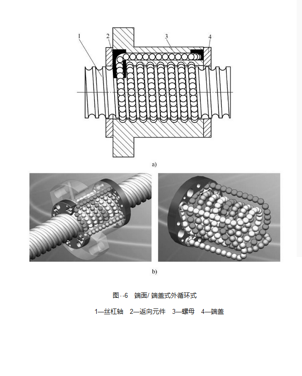 (2) 插管式。如圖5 所示, 插管外循環(huán)式把部分的成形彎管插入螺旋滾道一列工作圈兩端與滾道相切的通孔內(nèi), 以代替套筒-螺旋槽式的凹槽。以插入孔中的彎管端部舌形斜口或另裝其他形式的擋珠器來(lái)引導(dǎo)滾珠進(jìn)出彎管以構(gòu)成循環(huán)通道。根據(jù)循環(huán)管組件是否凸出螺母外徑, 插管外循環(huán)又可分為內(nèi)包式和外凸式。插管式的特點(diǎn)是結(jié)構(gòu)簡(jiǎn)單, 工作可靠, 工藝性好, 適于批量生產(chǎn), 公稱直徑與導(dǎo)程組合較多, 適用性廣, 回珠管可設(shè)計(jì)、制造成較理想的運(yùn)動(dòng)通道, 且允許絲杠副有較高的臨界轉(zhuǎn)速。相對(duì)于套筒-螺旋槽式, 滾珠循環(huán)進(jìn)出回珠孔時(shí)急劇轉(zhuǎn)彎而影響運(yùn)轉(zhuǎn)靈活性的缺點(diǎn)得到了極大改善, 但彎管凸出于螺母外部, 使螺母徑向尺寸增大, 在設(shè)備部件內(nèi)部安裝受了限制, 且彎管本身壁薄而耐磨性差, 當(dāng)利用彎管端部斜口做擋珠器用時(shí), 壽命更短。 目前此類結(jié)構(gòu)應(yīng)用極為廣泛, 并正在逐漸取代套筒-螺旋槽式滾珠絲杠副。由于它適用于重載高速的驅(qū)動(dòng)系統(tǒng), 也適用于精密定位系統(tǒng), 不論大導(dǎo)程、小導(dǎo)程、多線螺紋的滾珠絲杠副, 都顯示出獨(dú)特的優(yōu)越性。國(guó)外如日本, 就把插管式外循環(huán)作為普通系列, 而其他結(jié)構(gòu)形式均作為專用系列生產(chǎn)。 (3) 端面/ 端蓋式。端面/ 端蓋式外循環(huán)式結(jié)構(gòu), 如圖6 所示, 是一種在螺母端部配置滾珠返向器, 在螺母內(nèi)設(shè)置貫通孔的循環(huán)方式。在螺母壁厚上鉆有軸向通孔作為滾珠的返回通道, 螺母兩端面裝有返向器, 返向器接口與螺紋滾道相切, 并可引導(dǎo)滾珠進(jìn)入回珠通孔構(gòu)成閉合回路??蔀槎嗑€螺紋, 各自形成一個(gè)滾珠鏈。其特點(diǎn)是: 螺母徑向、軸向尺寸小; 高承載、高可靠性、低噪聲; 滾珠循環(huán)部的加工復(fù)雜。端面式外循環(huán)式結(jié)構(gòu)適用于低承載且速度、精度較高的場(chǎng)合, 或高承載且速度、精度較低的場(chǎng)合; 端蓋式外循環(huán)式結(jié)構(gòu)適用于多線、高承載、低轉(zhuǎn)速、低精度傳動(dòng)行業(yè)的應(yīng)用場(chǎng)合。近年來(lái)端面/ 端蓋式外循環(huán)式結(jié)構(gòu)在國(guó)內(nèi)逐漸被 廣泛使用。