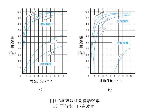 滾珠絲杠副傳動的摩擦系數(shù)經(jīng)試驗測得,一般為0.0025-0.0035,其傳動摩擦阻力大幅減小,傳動效率得 到很大提高。如圖1-3所示,當(dāng)摩擦系數(shù)μ=0.003、螺旋升角λ=2°時,傳動效率可達90%以上;當(dāng)螺旋升角λ=3°時,傳動效率可升至95%以上; 當(dāng)λ繼續(xù)增大時,傳動效率的理論值可高達98%,但其速率增加的緩慢。滾珠絲杠副傳動效率相當(dāng)于滑動螺旋傳動的2~4倍,滾珠絲杠傳動相對滑動螺旋傳動來說,能以較小動力推動較大負荷,而功率消耗只有滑動螺旋傳動的1/4~1/2,不僅能大幅減輕操作者的勞動強度,而且對機械小型化、起動后顫動和滯后時間的減少以及節(jié)省能源等方面都具有重要意義。